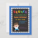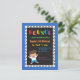 Una invitación diseñada para parecerse a un trampolín con la palabra "rebotar" en un gran tamaño de letra con cada letra en un color de arcoiris diferente. Un niño con tee blanco y pantalones cortos azules rebota alegremente sobre él. Para cualquiera que albergue la fiesta de cumpleaños en los parques de tranvías interiores o en su propio patio trasero. Personalice los detalles de su fiesta en un texto colorido.