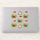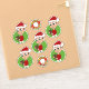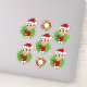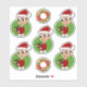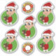 Juego de siete pegatinas cortados de vinilo con el ilustracion de un lindo y feliz niño hispano o asiático sonriente con un oso de peluche, vestido con ropa de Navidad y llevando un gorra rojo de Santa Claus, con un fondo verde; cinco pegatinas del niño y dos pegatinas con un Navidad cortaron la corona