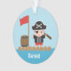 Para los niños amantes del pirata o de la navegación náutica, este bonito y colorido diseño es perfecto para decorar su habitación en una aventura marina. Tiene un niño vestido de capitán pirata con gorra de los huesos cruzados, parche para los ojos y un telescopio de navegación. Está en una balsa de madera con un barril y una bandera roja. Bueno, todos los piratas tendrán que empezar por alguna parte. Personaliza con el nombre del niño.