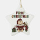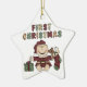 El primer adorable adorno navideño de un bebé con un niño vestido de rojo y una gorra llena de caldo y un texto multicolor que dice "¡Primera Navidad!