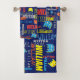 Cute los monstruos alienígenas de píxeles gráficos diseñados originalmente y nombre de texto manta personalizada. Estas toallas tipográficas de texto rojo brillante, naranja, azul, gris y amarillo también se pueden personalizar con tu propio nombre, dice William. Otros nombres disponibles o contactarme para solicitar un nombre. Arte original y diseño de Sarah Trett para www.mylittleeden.com