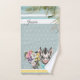 Única toalla de mano, artística y unisex para los niños en los cuartos de baño, con dos cebras Cute, una con flores en la cabeza y flores blancas dispersas en el fondo, hojas de helecho en la esquina superior derecha y texto personalizado sobre fondo azul de acero más ligero, rayado, diseñado por PiccoGrande.