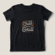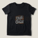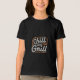 El diseño de la camiseta "Chill and Grill" presenta un ambiente relajado de verano, con una letra atrevida y juguetona para el texto "Chill and Grill". El diseño incluye una parrilla con llamas por debajo, que emana calor y energía. Alrededor de la parrilla hay detalles divertidos como herramientas de parrilladas, humo y una bebida refrescante, todo contra un fresco y relajado esquema de color que combina rojos cálidos y naranjas con blues y verdes fríos, capturando la esencia de un perfecto día de barbacoa.
