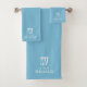 Un bonito conjunto de toallas de baño azules para niños que se pueden personalizar según tu nombre y el comienzo. El diseño utiliza una tipografía infantil para el nombre inicial. Decoran el baño de sus hijos con este bonito conjunto.