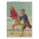 Imagen vintage de niños de ilustracion con un chica y un niño corriendo a la escuela a través de la hierba de un prado. Un hermoso día soleado, sin tiempo para caminar, este hermano y hermana no quieren llegar tarde!