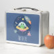Este diseño de caja de almuerzo escolar para niños, lindo y moderno, presenta un personalizado alienígena, con un barco de cohetes, extraterrestres, estrellas y luna, y puede ser personalizado con el nombre de tu hijo. En la lonja también hay un patrón de espacio en la parte trasera. ¡El perfecto espacio azul monstruoso añadido a los suministros escolares de tus chicos!