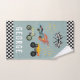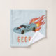 Este diseño de toallas para niños personalizado y genial tiene un patrón de auto, con un auto de carreras naranja y azul con ruedas negras, una moto y llamas calientes. También hay espacio para añadir el nombre y el monograma de los niños en la tipografía moderna. El regalo perfecto para los amantes de los autos de carreras de cualquier coche de juguete, camión o moto.