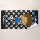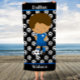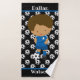 Toalla de baño con nombre personalizado para niños que presentan a un niño jugando fútbol con fondo de balón de fútbol.