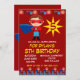 Llamar a todos los superhéroes niños plantilla de invitación a fiesta de cumpleaños para una fiesta de cumpleaños de niños en rojo. Estas lindas invitaciones Super Hero tienen a un chico superhéroe con una capa azul y una máscara de ojo roja con una "S" en su pecho para Superhéroe. Al lado del gran personaje de superhéroe hay un diseño de estrellas rojas y amarillas con la edad de su hijo. El límite superior de la invitación tiene superhéroes volando a través de la invitación. La frontera inferior tiene superhéroes en la parte superior de los edificios a lo largo del horizonte de la ciudad. La parte trasera de la invitación también tiene un superhéroe a todo color y otra estrella estalló en amarillo y rojo, con la edad de su hijo. El fondo de esta invitación es rojo intenso. El tipo de letra del texto de la invitación es blanco y amarillo brillante en el tipo de letra de un libro de historietas. Estas son invitaciones lindas y coloridas para los chicos que aman a los Super Heroes o a los personajes de historietas. Simplemente introduzca la información de la fiesta de cumpleaños de su hijo en los puntos de la plantilla. Utilice el botón personalizar it si desea mover las cosas o cambiar los colores del tipo de letra. Estas son invitaciones perfectas para una fiesta de cumpleaños de superhéroes para los chicos.