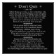 No dejes de poema —20 x 20 pulgadas— Poster de arte ******************************** Cuando las cosas salen mal, como a veces lo harán, Cuando el camino que estás transitando parece cuesta arriba, Cuando los fondos son bajos y las deudas son altas, y quieres sonreír, pero tienes que suspirar, Cuando el cuidado te está presionando un poco, descansa, si debes, pero no lo dejes. La vida es queer con su giro y sus giros, Como a veces aprendemos cada uno de nosotros, y muchas veces surge un fracaso, Cuando él hubiera ganado si lo hubiera sacado; No se rindan aunque el ritmo parezca lento, pueden tener éxito con otro golpe. El éxito es el fracaso girado hacia afuera; el matiz plateado de las nubes de la duda; Y nunca se puede decir lo cerca que estás, puede estar cerca cuando parece lejano; Así que aténganse a la lucha cuando son más afectados- Es cuando las cosas parecen peores que no deben renunciar.