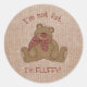 Un oso de peluche y agrio dice: "No estoy gordo, estoy esponjoso! El fondo es una tela falsa de lino.
