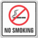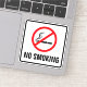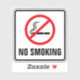 Un pegatina para no fumar con un cigarrillo negro debajo de un rojo, cruzado de círculo y el texto "No fumar" rodeado de un borde negro. Pegatina cuadrado con esquinas redondeadas.