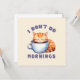 Abran su malhumor matutino con esta adorable tarjeta de saludo con un lindo gato naranja y la ingeniosa frase 'No hago mañanas'. Perfecto para los amantes del gato, del café y de los noctámbulos, este juego de diseño capta la esencia de los que necesitan café antes de tomar el día. ¡Un gran regalo para los amantes de los gatos y de las matanzas gruesas por igual!