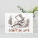 Recuerda a los demás con cualquiera de estas invitaciones oportunas que no lleguen tarde. Con el Sombrerero Loco corriendo, junto con el dicho oportuno "No Llegue Tarde". Ilustración clásica de John Tenniel encontrada en Las Aventuras de Alicia en el País de las Maravillas de Lewis Carroll. Recordatorio de aventura en el País de las Maravillas para todos los invitados.