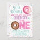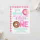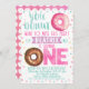Este chica no quiere perder esta invitación de cumpleaños a este Fiesta. Esta invitación de cumpleaños fiesta incluye dos donuts, algunos banners y elementos decorativos sobre un fondo blanco. Se trata de una forma dulce y a la última para invitar a los clientes a su pequeña fiesta de cumpleaños.