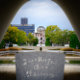 La imagen muestra el cenotafio conmemorativo en el Parque Conmemorativo de la Paz de Hiroshima con la inscripción 'Que todas las almas aquí descansen en paz para que no repitamos el error'.