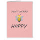 Diseño dulce y lindo que representa la frase "No te preocupes, sé feliz" con ilustracion de abeja. Imagen de emoji proporcionada por emojione.com.