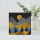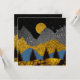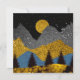 Resumen de diseño de paisajes montañosos en audaces tonos dorados, negros y azules con un amanecer y pájaros.