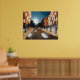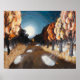 Pintura de una noche en otoño, con colores otoñales iluminados por el crepúsculo y la luna en alza. Los árboles parecen luminosos y brillantes y la luz de la luna brilla por un camino campestre con restos de la primera caída de nieve. La niebla se eleva de los parches sobrantes y se mueve en la corriente del viento. El amanecer combinado con el atardecer arroja una luz brillante sobre las vívidas rgenes ramas naranjas y el cielo azul profundo. Las hojas parecen brillar y brillar a medida que la brisa pasa por el bosque y alrededor de los troncos estables de los árboles. El camino parece conducir a la luna a medida que atraviesa bosques oscuros y un follaje vibrante, lo que conduce a un pequeño viaje de contemplación contemplativa.