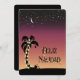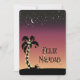 Vivo en Florida y decorar palmeras al aire libre con luces blancas envueltas y adornos colgados en los frondes es un lugar común, así que lo que modelé esta silueta de palma envuelta en luz contra un fondo de puesta de sol que se desvanece en la noche estrellada después. Hay un acento de pintura y pala de arena y una cadena de luces con letras Feliz Navidad. Espacio de fotos y mensajes para el personalizar de atrás.