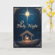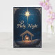 Celebre la maravilla de la Navidad con esta tarjeta bellamente diseñada que presenta una radiante escena de la natividad bajo un cielo nocturno estrellado. Una brillante estrella guía brilla sobre el pesebre, donde María y José se arrodillan junto al niño recién nacido. Bordes ornamentados y detalles elegantes enmarcan la obra de arte, creando un recuerdo atemporal que honra el verdadero significado de la temporada. Perfecto para compartir fe, alegría y bendiciones sinceras con familiares y amigos.