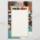 Estacionaria con tipografía nocturna de póquer. El fondo es una imagen débil con fichas de póquer y cartas de juego en una mesa de juego verde. En la parte superior hay un juego de 4 cartas con siluetas de niños y chicas con el texto: Noche de Póker. Escrito en grandes letras en negrita. El centro tiene un cuadrado de color crema donde se puede escribir el texto.