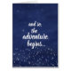 Simple con todo perfeccione para los nuevos acontecimientos de los beggings como las graduaciones, recién nacido, o los recienes casados, este cielo nocturno estrellado azul y blanco "y por eso, la aventura comienza" la tarjeta de felicitación es la de manera perfecta de ofrecer palabras del estímulo y del amor. La tipografía interior se puede cambiar a su decir deseado o la cancelación a dar escribe su propio mensaje especial.