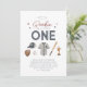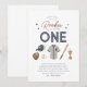 Celebra el primer cumpleaños de tu pequeña persona con el tema del béisbol con este diseño que presenta la tipografía "Nuestra pequeña novata está girando una" y detalles de acuarela alrededor de ella.