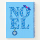 Libro de recetas en el saludo "Noel" con estampados retro y modernos árboles de Navidad en tonos azul hielo, adornado con un sprig hueco y un adorno de copo de nieve