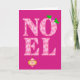 Tarjeta con la felicitación "Noel" con un patrón de árboles de Navidad modernos retro en tonos de rosa suave, adornada con un ramo de acebo y un adorno de Navidad - el texto interior es totalmente personalizable