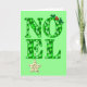 Tarjeta con el saludo "Noel" con un patrón de árboles de Navidad modernos retro en tonos de verde esmeralda, adornados con una ramita de acebo y un adorno de estrella - el texto interior es totalmente personalizable