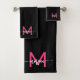 Disfrute de nuestro juego de toallas de baño con un monograma de escritura moderno y caliente de color rosado. Este lujoso juego de toallas está personalizado con su nombre en un elegante y moderno guión que le da un toque personalizado y de moda. El conjunto, hecho con tejidos absorbentes y ultraligeros, incluye bañera y toallas de mano, perfectas para añadir un toque de estilo a tu cuarto de baño. Duraderas y lujosas, estas toallas de moda combinan comodidad con personalización, haciendo que su tiempo de baño sea elegante y único.