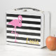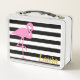 Un flamenco rosado se está colocando en el lado izquierdo. Esta fiambrera metalizado tiene un modelo rayado blanco y negro como el fondo. Personalice la fiambrera añadiendo el nombre del beneficiario en falsa escritura del oro (no del efecto metalizado) en la esquina inferior derecha.