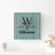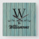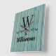 En este elegante reloj de pared hay verde azulados tablones de madera rústica azul con una letra y un nombre familiar que se puede personalizar haciendo que sea único. Rústica casa de campo vibra.