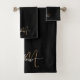Una elegante toalla de nombre de monograma dorado con guión de batido para la decoración del baño. Guión blanco monograma dorado, en negro.
