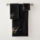 Una sencilla toalla minimalista monogramada en la decoración del cuarto de baño. Guión blanco monograma dorado, en negro. guión de intercambio de moda.