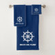 Una bonita toalla de baño personalizada con el nombre de su familia o del barco. Con una noria náutica diseñada por un personalizado - casco blanco sobre azul marino clásico o cambiar fácilmente el color de fondo para que se ajuste a su decoración actual. La perfecta incorporación a su casa, casa de playa o casa de vacaciones.