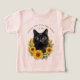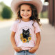Sombras y tee de gato negro para niños, o traslado a camisetas para adultos, tanques o sudaderas. texto curvado personalizar, en marrón oscuro, en la parte superior con el nombre de la granja o cualquier texto. Añádase también el año establecido para un rancho, una casa de campo o un hogar. Mostrado en la camisa rosada de melocotón de un niño pequeño.