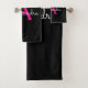 Toalla de baño con nombre de monograma de escritura simple en negro y rosa caliente. Esto hace que el regalo perfecto para alguien que ama el lujo glamoroso y los estilos chic en cumpleaños dulces 16, boda, despedida de soltera, aniversario, baby shower o fiesta de soltera.