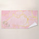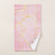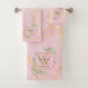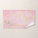 Juego de toallas de baño elegantes con nombre de monograma de acuarela verde con un monograma dorado inicial sobre un fondo de geoda de ágata rosa. Diseñado por Thisisnotme©