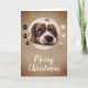 Tarjeta de vacaciones de Navidad familiar con nombre de perro rústico y foto. El fondo es beige rústico con copos de nieve blancos y huellas de patas negras. Personalice la tarjeta con la foto de su perro, el nombre de la familia y el año. Puede utilizar esta tarjeta personalizada para cualquier mascota. Una encantadora tarjeta de Navidad para un dueño de perro.