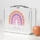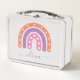 Cute boho arcoíris caja de almuerzo para chicas. Naranja pastel colorido, morado y arcoiris rosa con el nombre de personalizable en color morado. Las estrellas y los corazones se dibujan dentro del arco iris. Excelente regreso a la caja de almuerzo escolar para los niños.