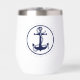 Este diseño de vaso de vino termal presenta un llamativo diseño azul marino de un ancla y cuerda rodeado por un marco circular con el nombre de su barco, número de registro y apellido u otro texto. Es el regalo perfecto para el lanzamiento de un barco, una nueva casa de campo o una casa de lago. Busque ID619 para ver otros productos con este diseño.