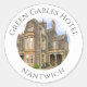 Pegatinas del hotel con el nombre y la dirección del hotel más la fotografía. Carga tu propia fotografía para reemplazar la imagen del marcador de posición. Debería tener forma circular automáticamente.