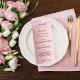 Carta de menú de la fiesta de cumpleaños. Personalice y agregue un nombre, edad, fecha y el menú. El fondo de color rosa falso metálico, decorado con finas purpurinas, chispas. Letras de color negro.