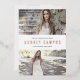 La invitación de moda y graduación moderna incluye dos de tus fotos horizontales/paisajísticas favoritas divididas por una banda blanca que lleva el nombre del graduado en Relieve metalizado de oro rosa, escuela y año de graduación. Personaliza el reverso de una foto adicional y un mensaje personal.