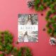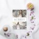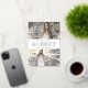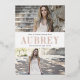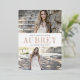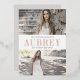 La invitación de moda y graduación moderna incluye dos de tus fotos horizontales/paisajísticas favoritas divididas por una banda blanca que lleva el nombre del graduado en Relieve metalizado de oro rosa, escuela y año de graduación. Personaliza el reverso de una foto adicional y un mensaje personal.