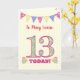 Una tarjeta de cumpleaños número 13 bonito para que puedas personalizar en la portada, con un racimo de puntos de polka, flores de primrose y números rellenos con un patrón de primrose, todo en un fondo de gingham amarillo pálido. El mensaje de la portada es: '¡Para (espacio para que añadas el nombre) 13 HOY!' El mensaje interno es sólo una sugerencia y puede personalizarlo o eliminarlo fácilmente si lo prefiere.