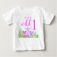 Esta camiseta de bebé está decorada con animales de la selva pintados a mano con acuarela, jirafa, tigre y león rodeados de hojas tropicales en tonos púrpura, rosa y verde.