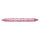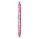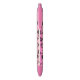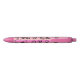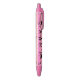 Lápiz de tinta negra con nombre personalizado que incluye composición de letras con corazones y sellos de ilustracion en color negro contra un fondo rosado.